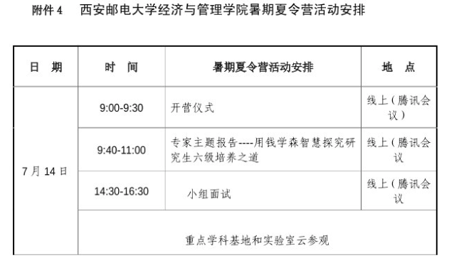 根据西安邮电大学“优秀大学生夏令营”实施办法,结合我院实际情况,为促进优秀大学生之间的沟通交流,增进对我院各个学科专业的深入了解,西安邮电大学经济与管理学院暑期夏令营将于2020年7月在西安开营。本次夏令营活动面向全国各大高校,主要通过线上专家报告会、重点学科基地和实验室云参观和线上师生座谈等形式,让来自全国各地的优秀入营学生近距离与专家学者交流,了解学科的发展的前沿动态,分享学习经验,并从中选拔优秀大学生免试攻读或一志愿报考我校研究生。